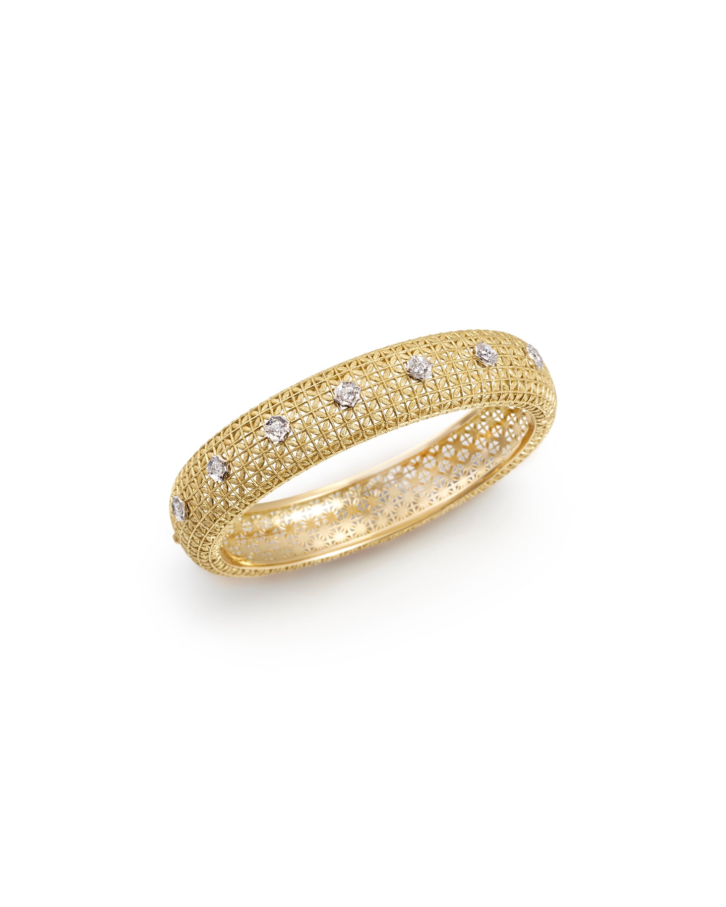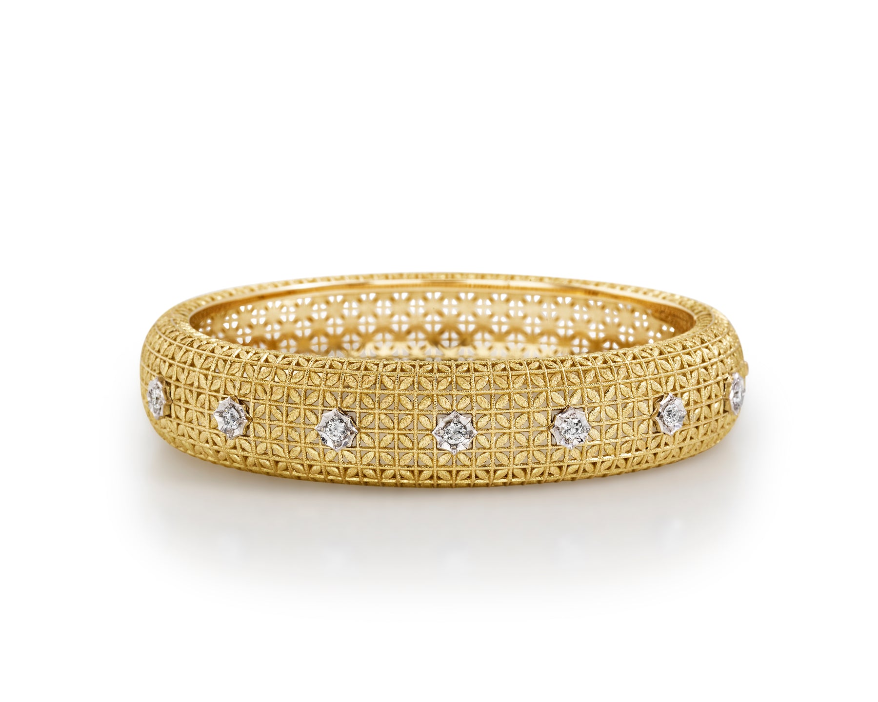 Meaning "gold lattice" in French, the Treillis d'Or Cuff is a modern interpretation of the traditional "traforo fiorentino" goldsmithing of Florence to create a contemporary œuvre d'art. With a hollowed center for light, everyday wear, every inch and petal of the lattice is hand engraved and worked with the same distinctive craftsmanship that is synonymous with Florence.
